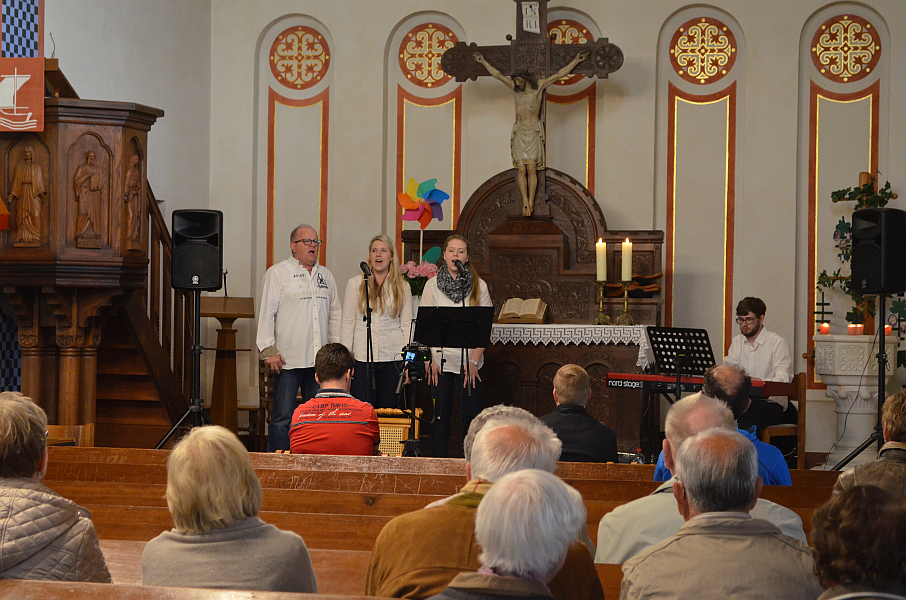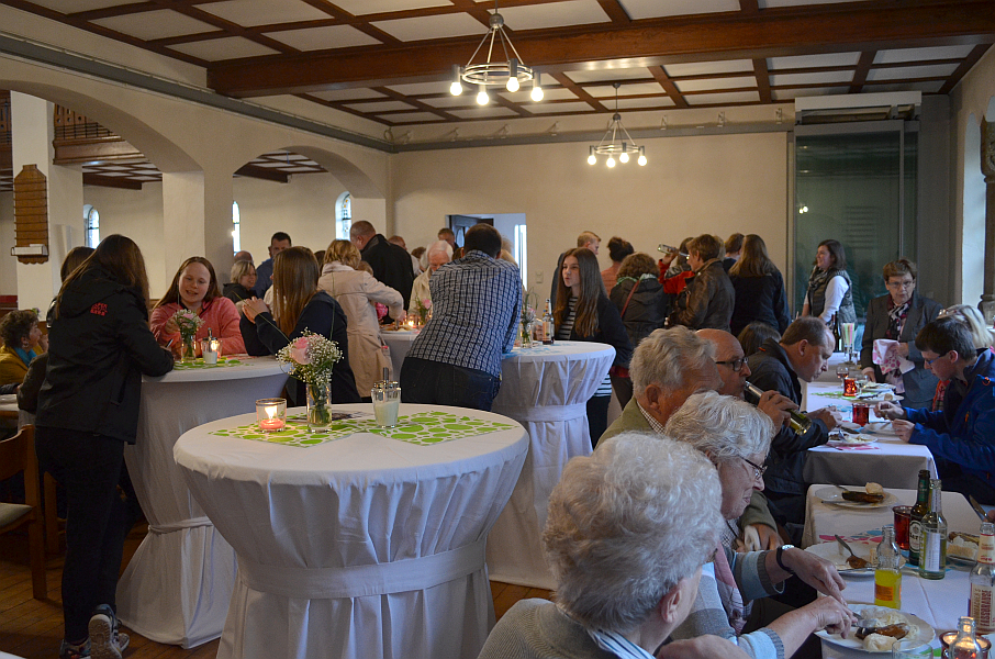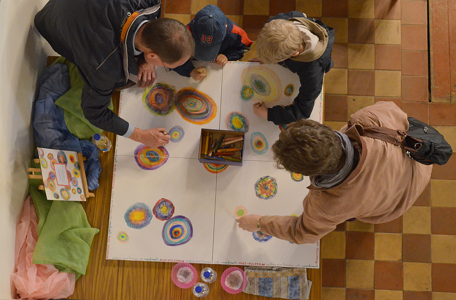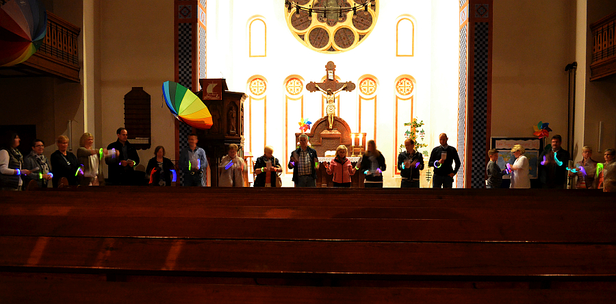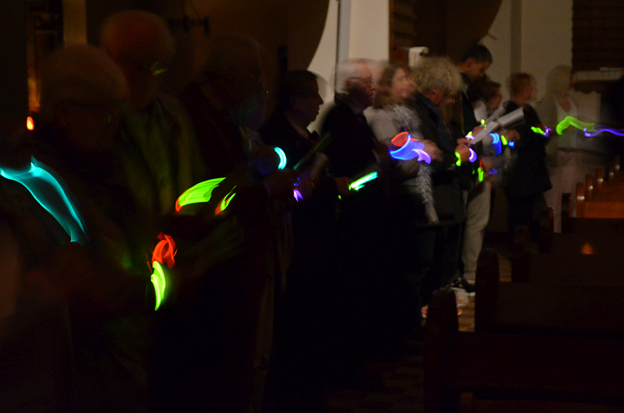 Der Abend des Pfingstsonntags stand in diesem Jahr unter dem Thema „Gottes Geist hat viele Farben“. Nach dem Gottesdienst, in dem auch der neue Presbyter Marcus Harm eingeführt wurde, gab es ein gemeinsames Abendessen mit Grillfleisch und kleinen internationalen Beilagen. Während des ganzen Abends konnten sich die Besucher kreativ mit Buntstiften und Fingern an einem gemeinsamen Bild aus bunten Kreisen einbringen. Ab 20:30 Uhr sorgten vier Musiker der Band Vocal-Eight mit besinnlichen Liedern für musikalische Unterhaltung. Anschließend las Christiane Fennekohl internationale Märchen auf der Orgel-Empore. Den Abschluss bildete um 22:00 Uhr das Agapemahl im Kirchsaal. Mit einem großen Kreis im dunklen Kirchenraum, bei dem die bunten Armreifen aus Knicklichtern beim Schlusslied stimmungsvoll zur Geltung kamen, endete die Kirchennacht in Hagedorn.