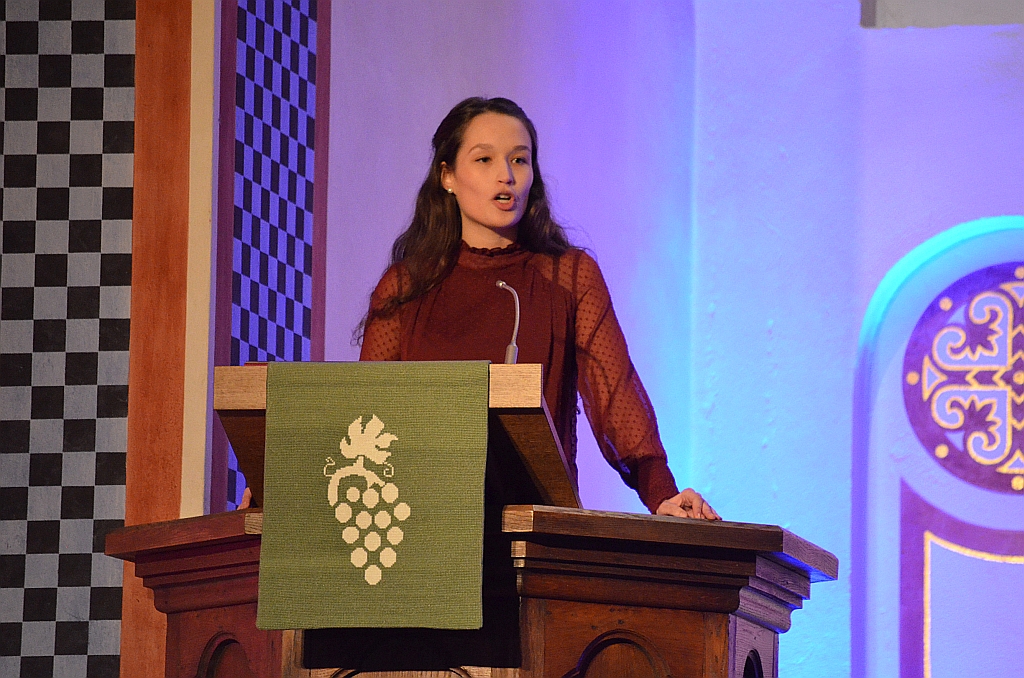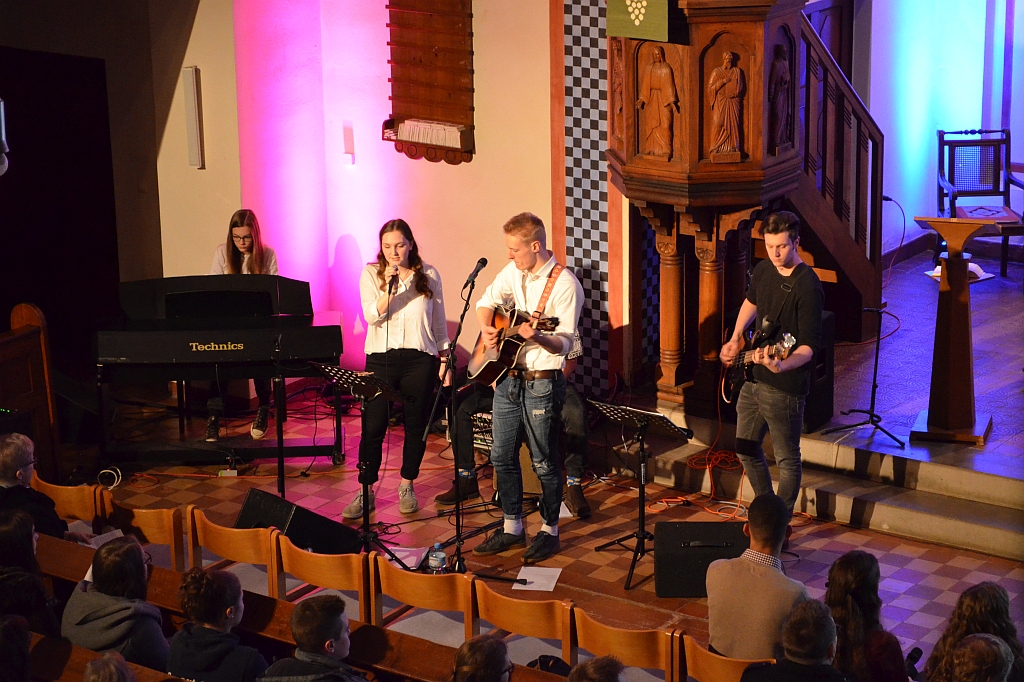 Mit modernen Klängen gestaltete die Band, bestehend aus der Pianistin Julia Schütte, Simon Ossowski am Cajón, Nils Peitzmeier am Bass, dem Gitarristen und Sänger Jonas Moritz sowie Sängerin Janneke Saeger den Gottesdienst, in dem die aus Hagedorn stammende Theologiestudentin Mirjam Schöneberg eine authentische Predigt hielt.