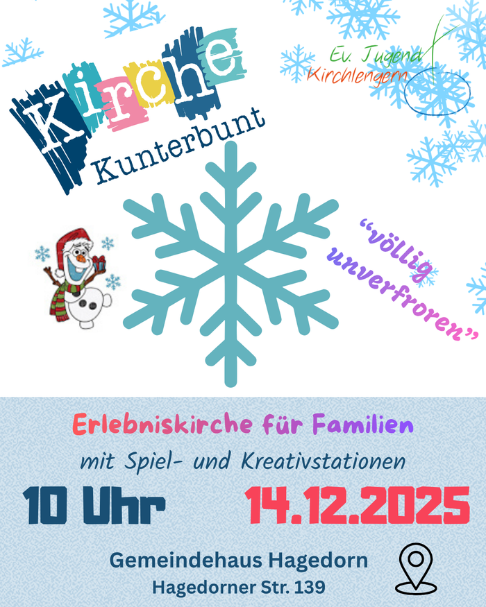 „Völlig unverfroren“ findet die nächste „Kirche Kunterbunt" am 14. Dezember um 10:00 Uhr im Hagedorner Gemeindehaus statt.
