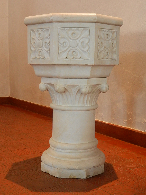 Der werksteinerne Taufstein mit kurzem Fuß und ornamentalem Kapitell zeigt die achteckige Pokalform des 19. Jahrhunderts mit Schmuckteilen nach dem Stile der Zeit. Am Rande der Taufschale ist der Bibelvers „Wer da glaubt und getauft wird, der wird selig werden“(Mk. 16, 16) eingraviert.