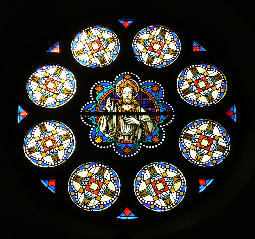 Kanzel, Altar und Taufstein befinden sich im Chorraum unter dem Glockenturm. Im schwarz-blau gewürfelten Triumpfbogen zum Chorraum steht das Bibelwort aus dem Johannesevangelium „Ich bin das Brot des Lebens“(Joh. 6, 35). Einen Hauptakzent bildet das stark farbige Rosettenfenster über dem Altar mit der Halbfigur des segnenden Christus, umgeben von acht Medaillons mit Kreuzornamenten.