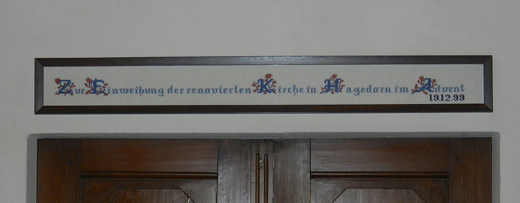 Seit Februar 1977 steht die Hagedorner Kirche unter Denkmalschutz. Im Jahre 1999 fand eine umfangreiche Renovierung statt, bei der auch die ursprüngliche Deckenbemalung wiederhergestellt wurde.