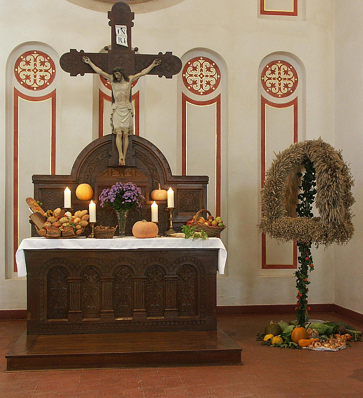 Der rustikale, aus Eichenholz gefertigte Altar trägt ein Kruzifix. Die helle Gestalt des Gekreuzigten auf dem Hintergrund des dunklen lateinischen Holzkreuzes beherrscht die Szene. Die Balken des Kreuzes sind an den Enden als Medaillons mit Rosetten ausgebildet. Neben der allgemeinen Ornamentik im Flachrelief zeigt das Mittelstück der Vorderwand des abgestuften Altars das Symbol für den Weinstock mit Reben und Trauben.